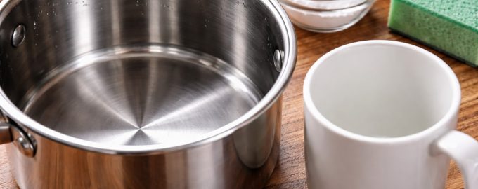 – Turnați apă fierbinte într-un recipient (nu apă clocotită, ci aproximativ 70-80 de grade). – Turnați o lingură de acid pentru fiecare litru de apă. – Lăsați vasele în soluție până când lichidul se răcește complet. – Clătiți suprafața cu un burete moale.