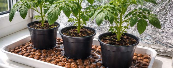 Tavă cu argilă expandatăumplută cu apă creează o cupolă protectoare de răcoare în jurul tulpinilor.