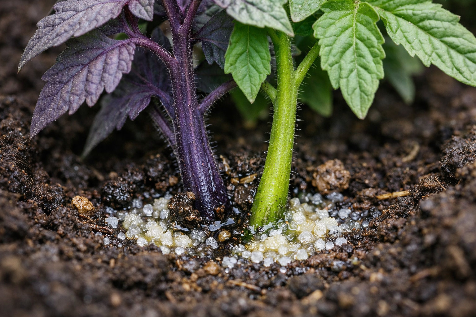 Când temperatura solului scade sub 14°CSistemul radicular al tomatelor încetează practic să asimileze fosfor. Chiar dacă acest element este abundent în sol, în solul rece el este transformat într-o formă inaccesibilă plantei. Ca urmare, țesuturile acumulează antociani – pigmenți care dau culoarea foarte albastră-violet. Aceasta este o reacție de apărare la stresul provocat de frig și lumină.