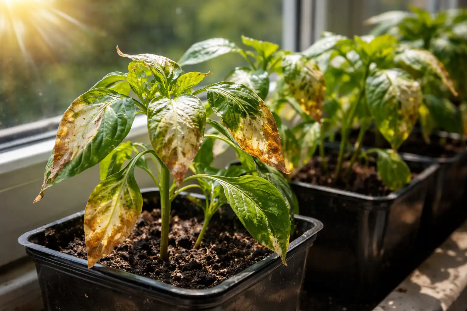 Principala capcană constă în faptul că soarele de primăvară este înșelător. Sticla de la fereastră acționează ca o lupă, concentrând razele pe țesuturile fotosintetice. Ardeii care au crescut sub phytolamp sau pe vreme noroasă sunt deosebit de afectați: celulele lor nu au avut timp să dezvolte pigmenți protectori.