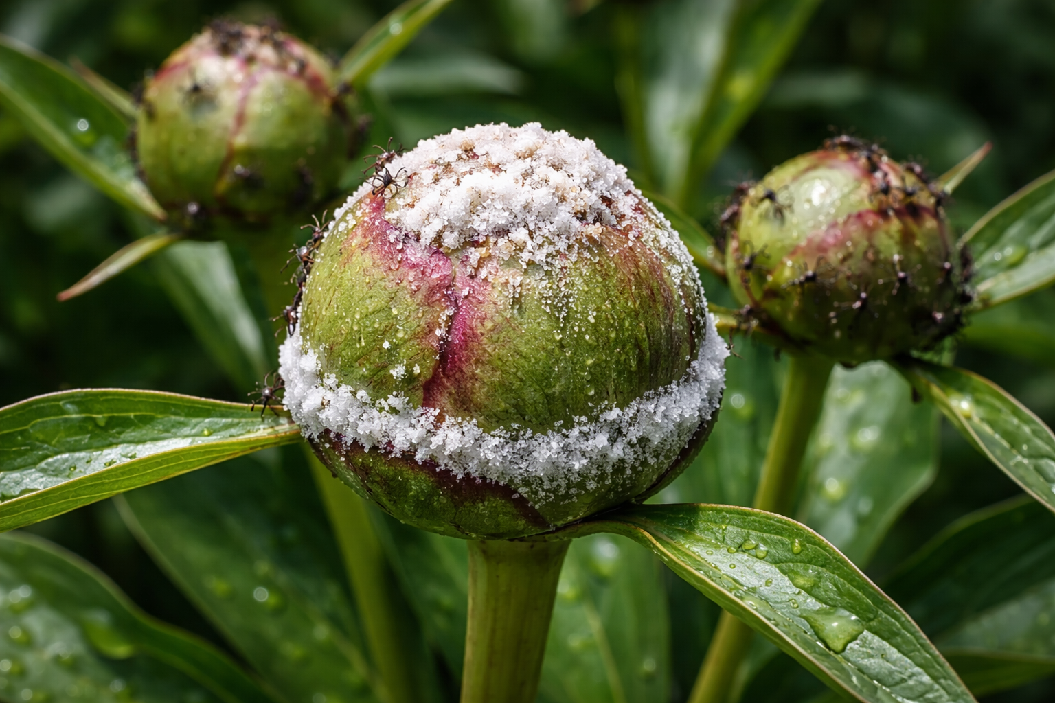 Furnicile sunt atrase de nectar dulcecare este secretat de sepalele bujorului în timpul perioadei de creștere activă. Acestea sunt rareori dăunătoare critic în sine, dar prezența lor poate duce la apariția afide afide și boli fungice, care pot provoca ofilirea mugurilor înainte de înflorire.