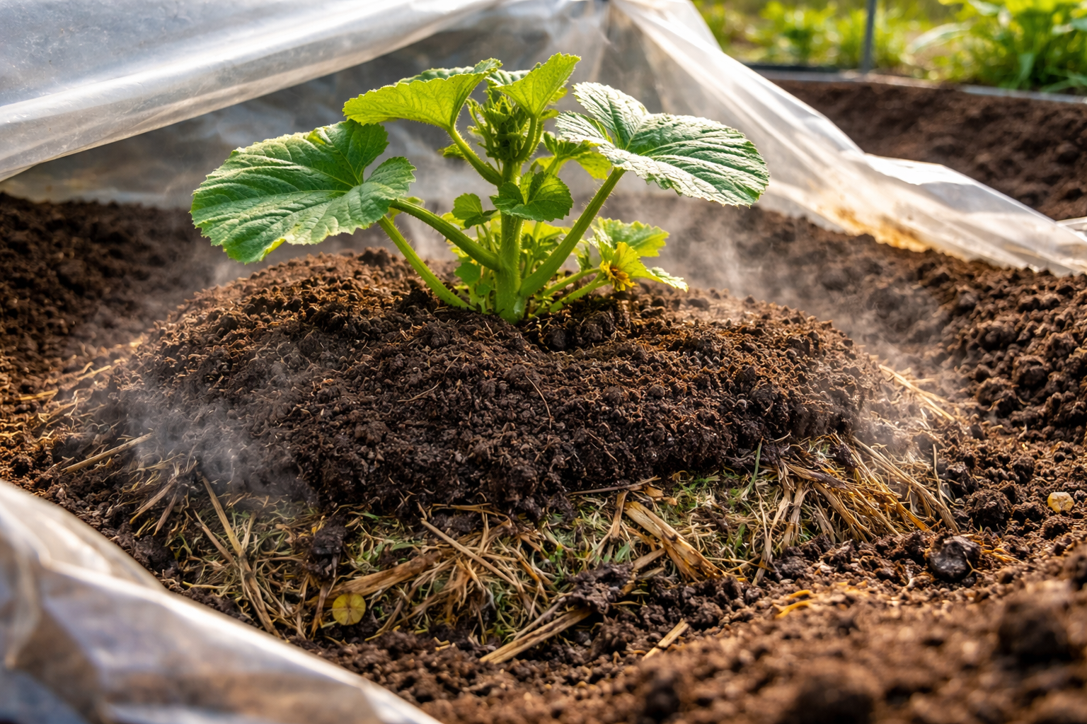 Utilizare mulcire cu material de culoare închisă pentru a reține căldura pe timp de noapte.