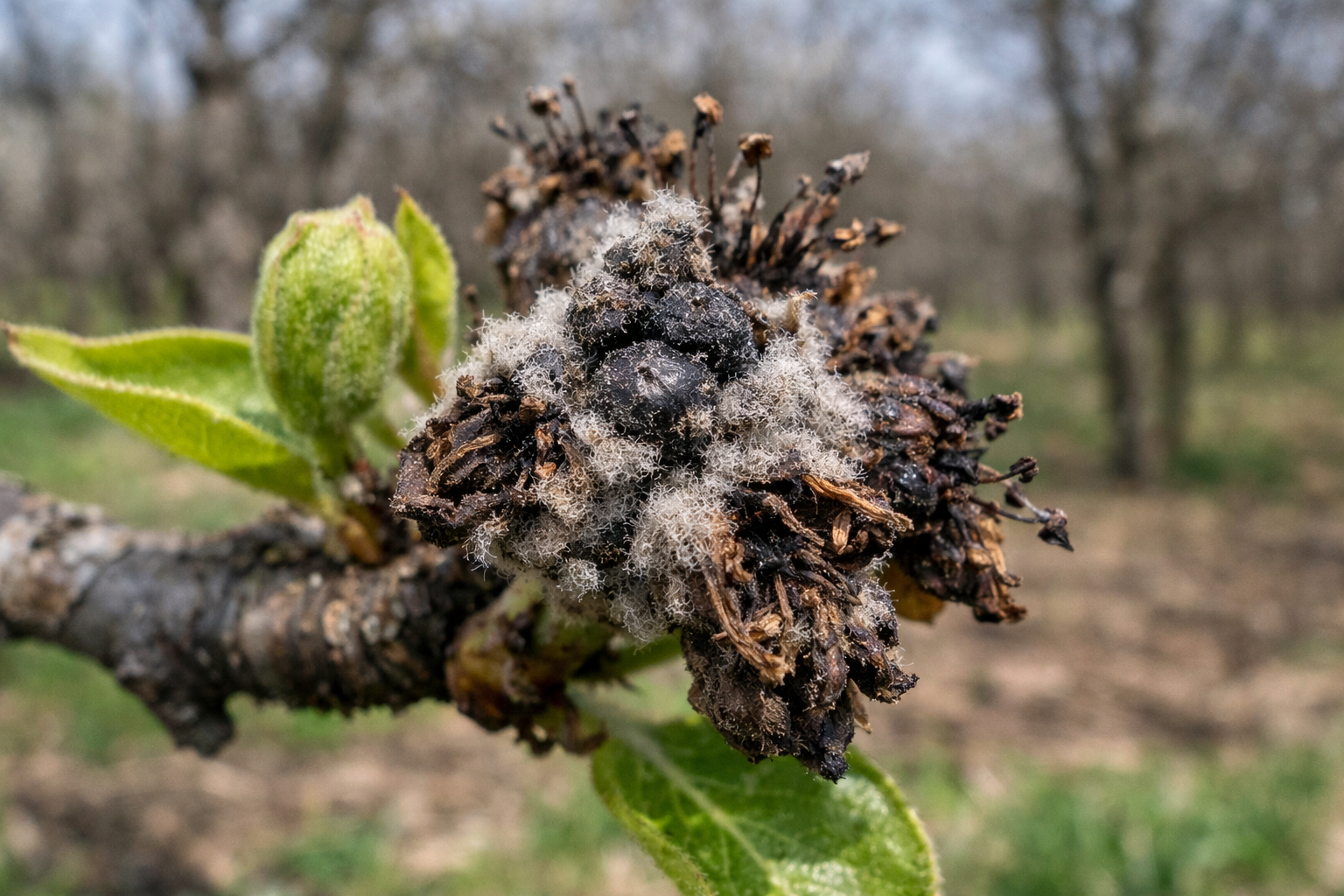 Îndepărtați fructele de anul trecut rămase pe ramuri, deoarece acestea sunt principalele surse de spori. arsura moniliacă.