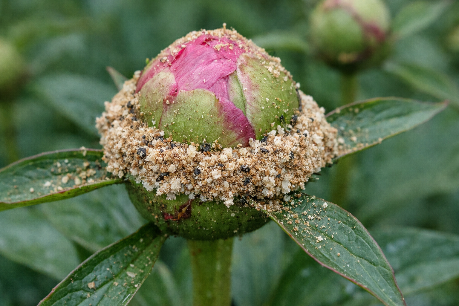 Furnicile sunt atrase de sirop de carbohidrațicare este secretat de sepalele bujorilor în timpul perioadei de înmugurire activă. Insectele în sine ucid rareori planta, dar devin „fermieri” pentru afide, care se dispersează activ către lăstarii tineri.