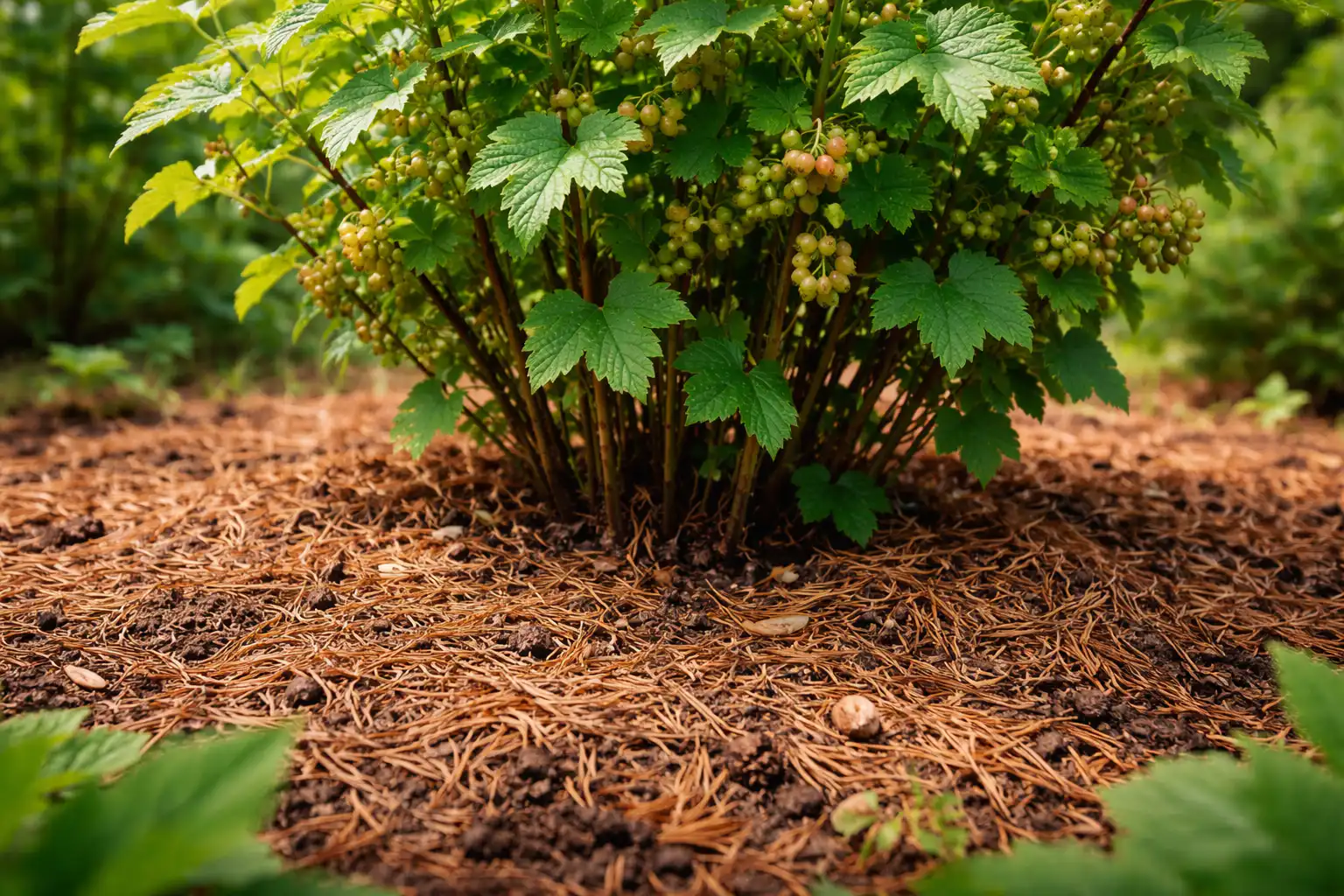 Zmeură и coacăz – mulciul cu ace de pin reține solul liber pe care acești arbuști îl iubesc atât de mult.