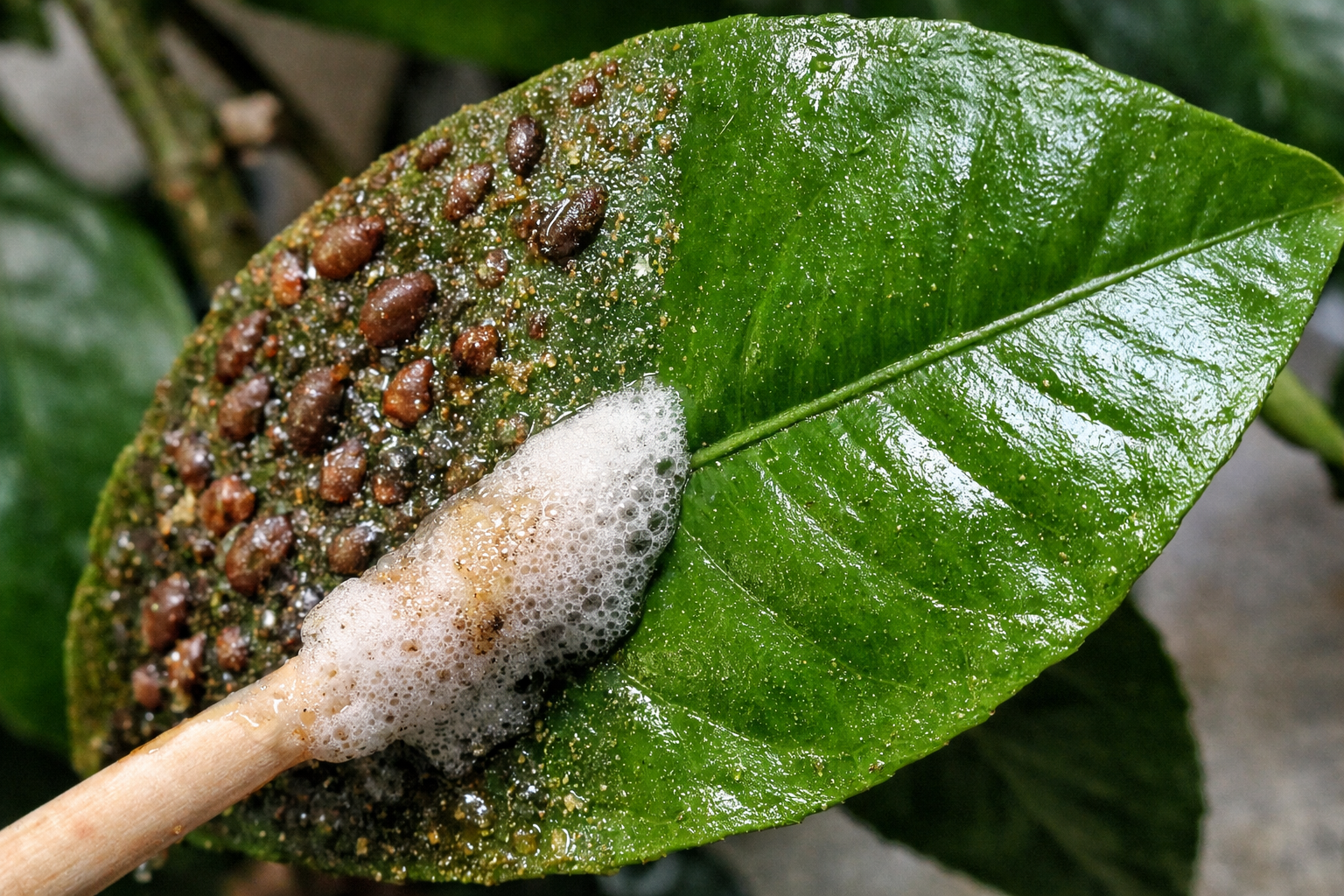 Îndepărtați manual fiecare placă maronie de pe ramuri și frunze prin umezirea periei în soluție.