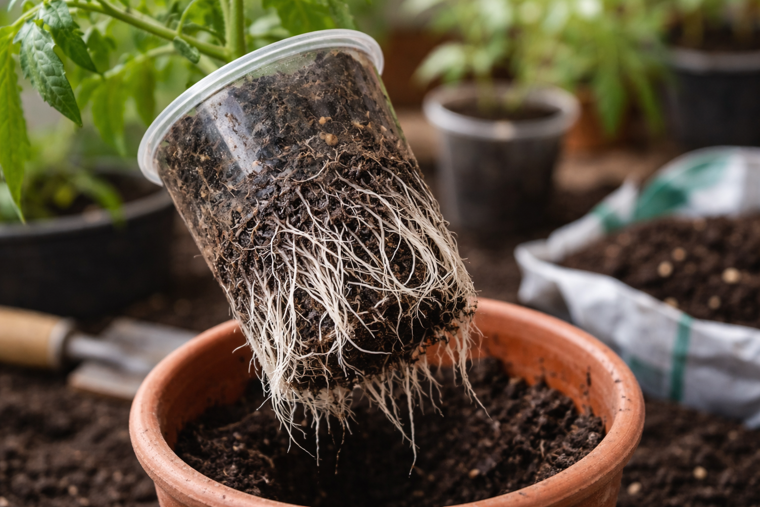 Atunci când rădăcinile roșiilor umplu întregul volum al ghiveciului, ele încep să se suprime reciproc. Planta își dă seama că nu există suficiente resurse pentru a crește întreaga masă și începe să „arunce balastul”. Ea preia nutrienții mobili din frunzele inferioare vechi și îi redirecționează către punctul de creștere.