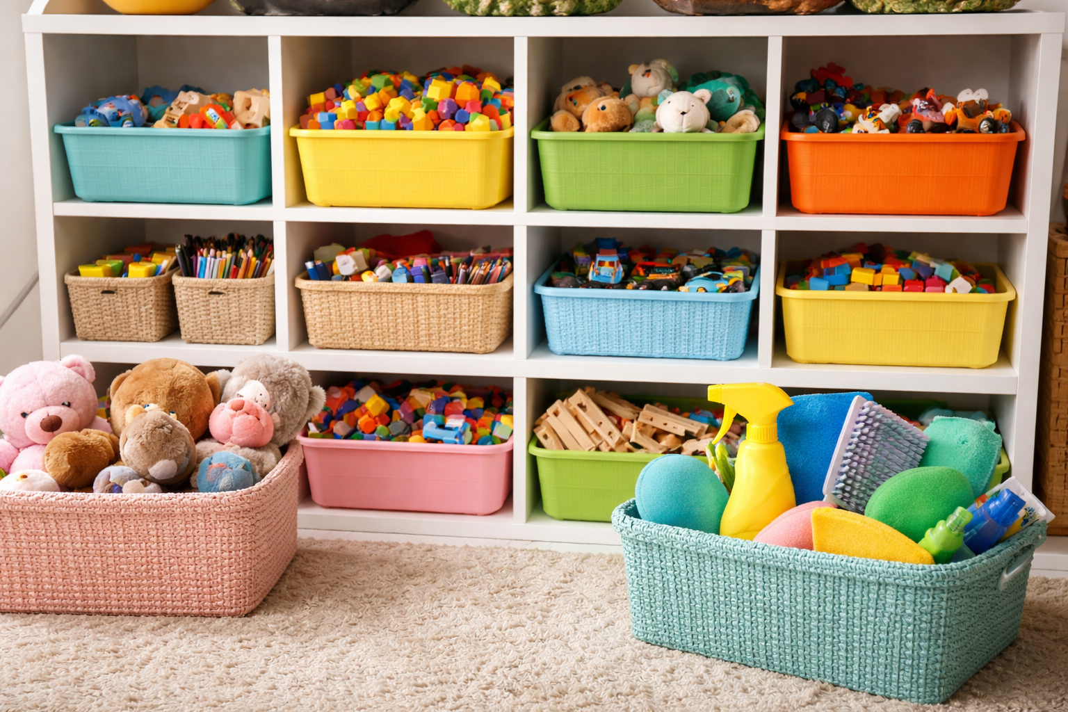 Utilizați echipamente viu colorate: mături mici, cârpe colorate sau coșuri personale de jucării.