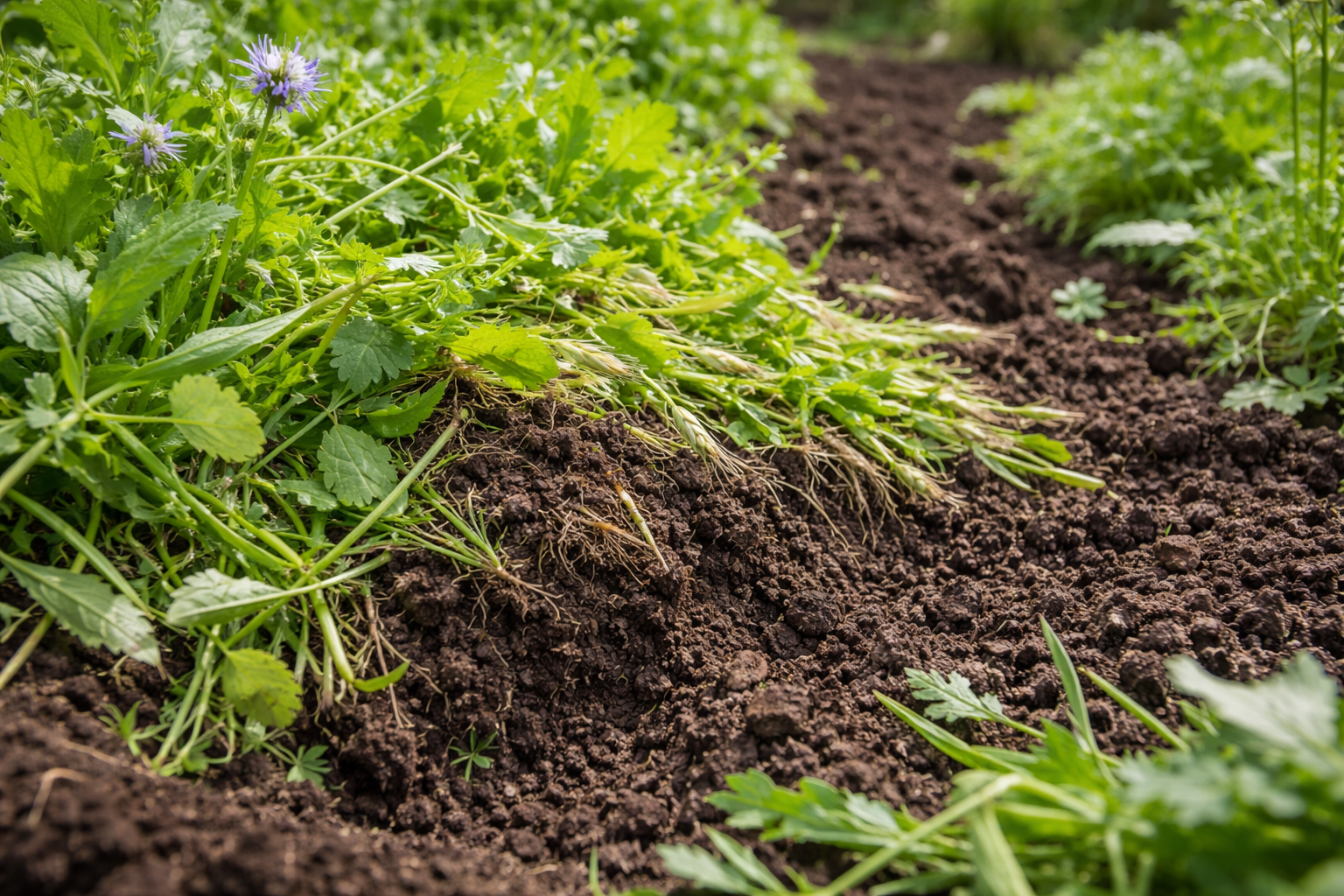 Este important să nu lăsați plantele să înflorească. Tulpinile trebuie să rămână moi și suculente, astfel încât microorganismele din sol să aibă timp să le proceseze. Eu tai verdețurile când ajung la o înălțime de cincisprezece până la douăzeci de centimetri. Această cantitate de biomasă este suficientă pentru a înlocui o porție întreagă de mâncare compost.