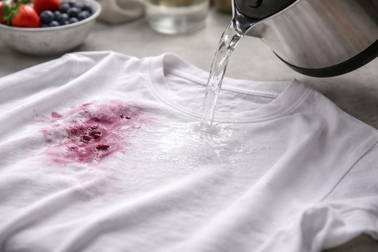 Pentru majoritatea petelor proaspete, soluția ideală este metoda de vărsare. Personal am recuperat zeci de tricouri albe în acest mod după sezonul fructelor de pădure. Principalul lucru este fără panică și secvența corectă: