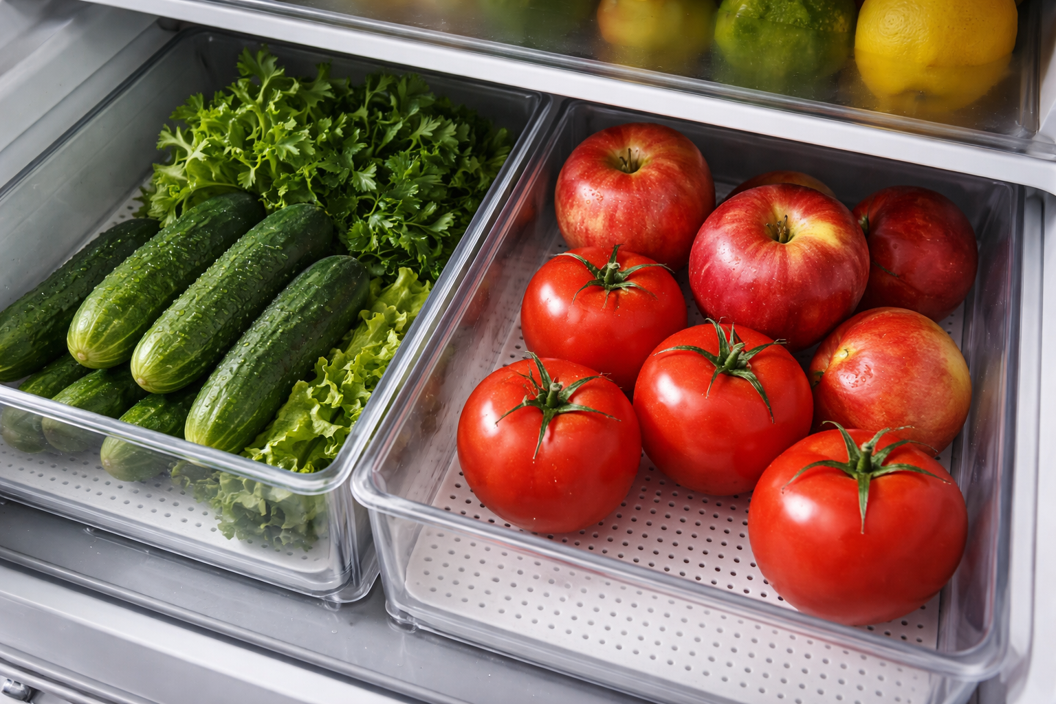 | Castraveți | Raftul frigiderului (nu în sertar) | Roșii |