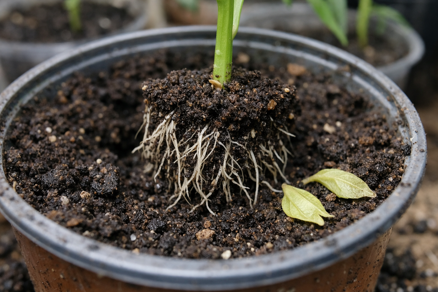 Spre deosebire de roșii, ardeii au un sistem radicular foarte sensibil. Orice microdaună forțează planta să intre în modul de supraviețuire. Pentru a economisi umiditate și energie pentru regenerarea rădăcinilor, răsadul scapă de „balastul suplimentar” – frunzele sale.