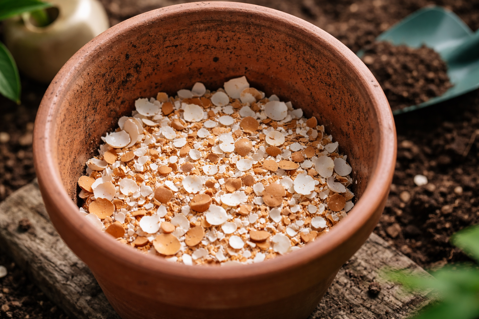 O nuanță secretă: înainte de utilizare, cojile trebuie calcinate în cuptor sau spălate bine cu apă clocotită pentru a evita apariția musculițelor și a mirosului neplăcut în sol.