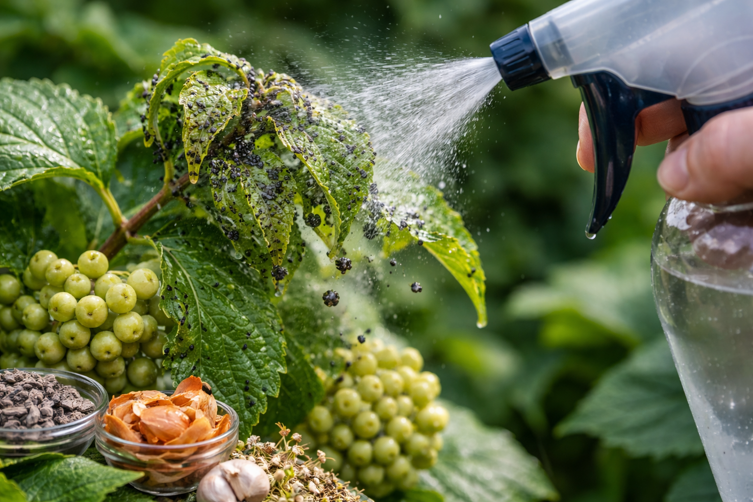 Extractul de usturoi dezinfectează suprafața frunzelor și previne re-infestarea.