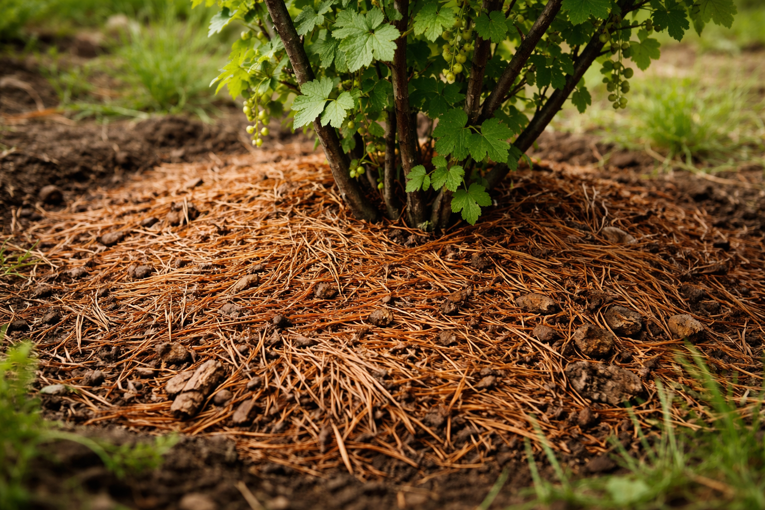 Mulți grădinari subestimează potențialul acelor comune de pin și molid. Corect mulcire cu acest material creează un mediu ideal pentru sistemul radicular. Acele suprafertilizate îmbogățesc treptat solul cu materie organică, stimulând dezvoltarea organismelor benefice. micoriză – ciuperci simbiotice care ajută arbuștii să absoarbă nutriția.