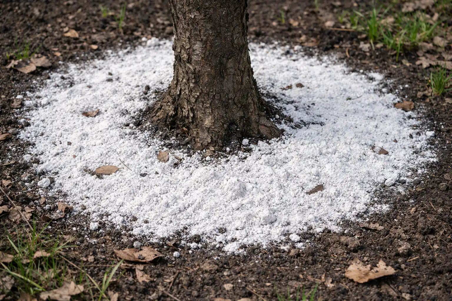 Principalul secret de aplicare: aplicați pudra numai de-a lungul proiecției coroanei, unde se află rădăcinile sugătoare active, și nu direct pe trunchiul copacului.
