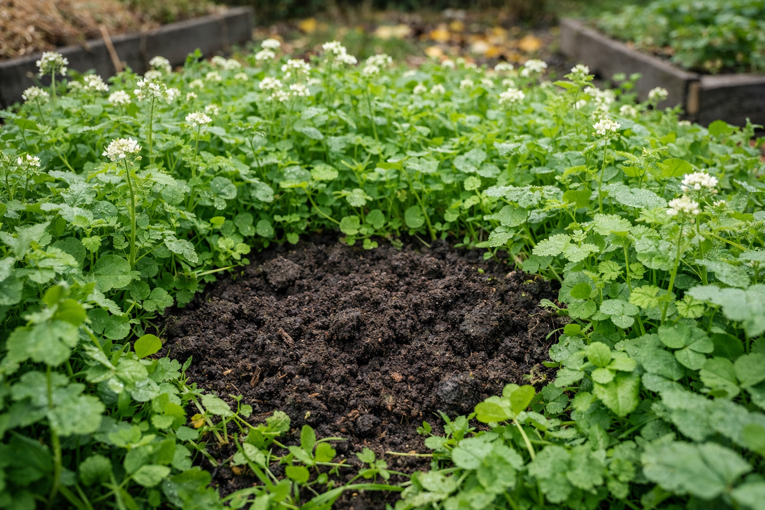 Însămânțarea densă de îngrășăminte verzi este pe deplin comparabilă ca eficacitate cu aplicarea de mulci de bună calitate.