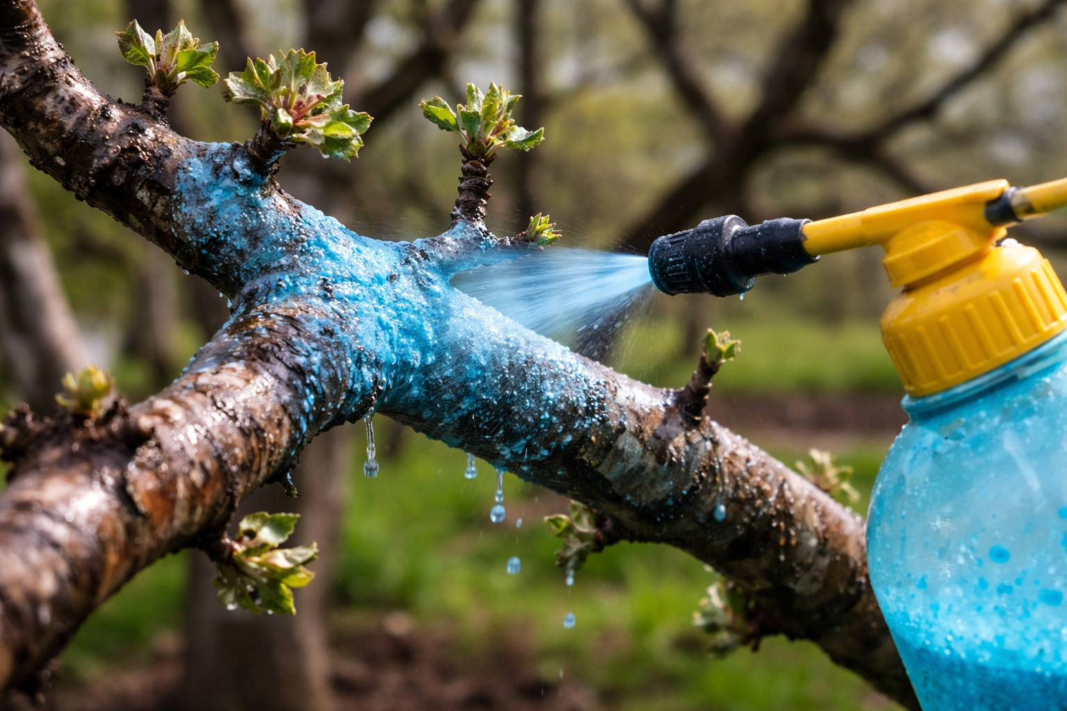 Pulverizați bine trunchiul și ramurile scheletice până când picăturile albăstrui se scurg ușor.