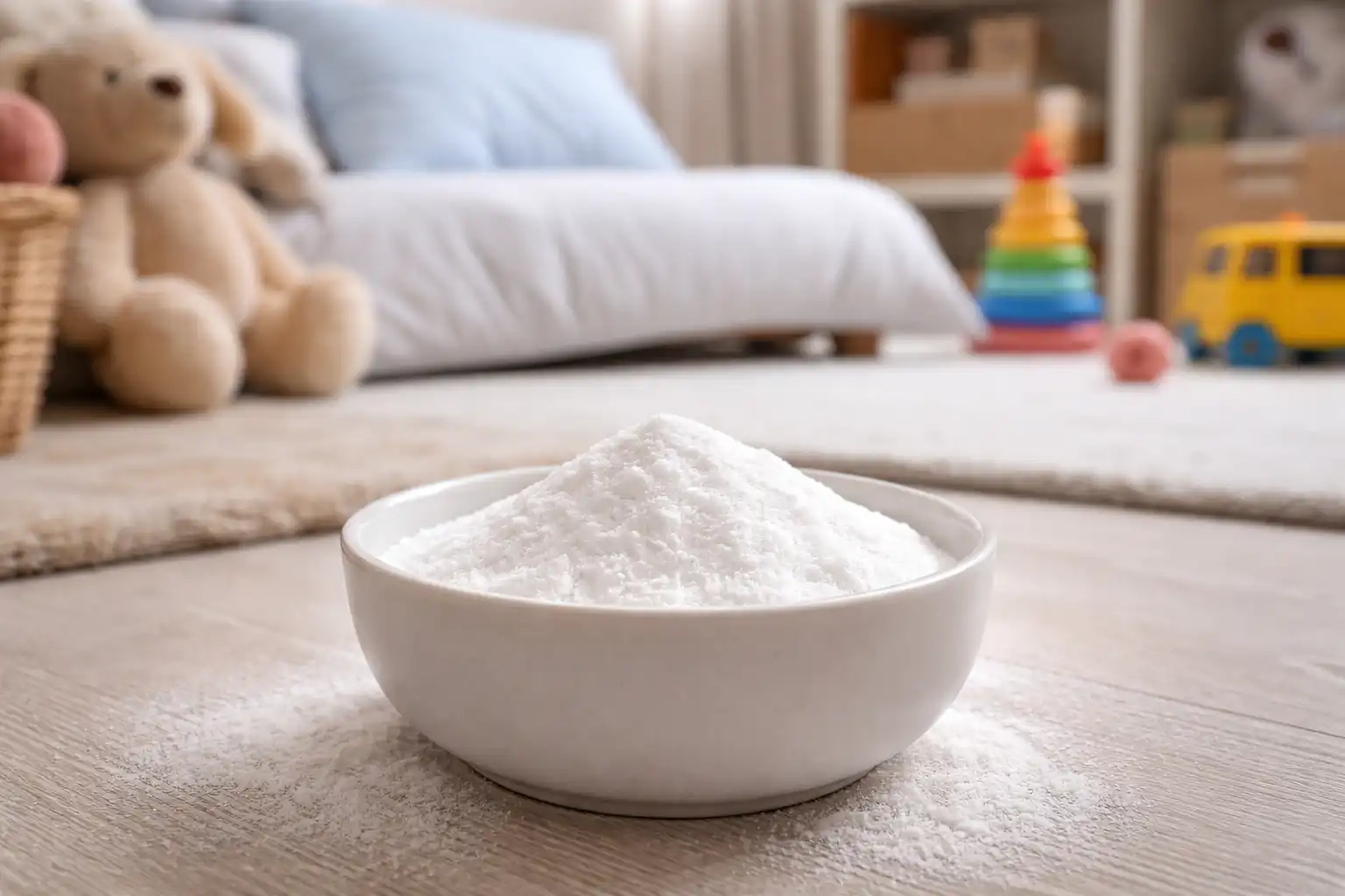În primele luni de viață, cel mai bine este să evitați orice parfumuri puternice și să folosiți doar bicarbonat de sodiu pur.