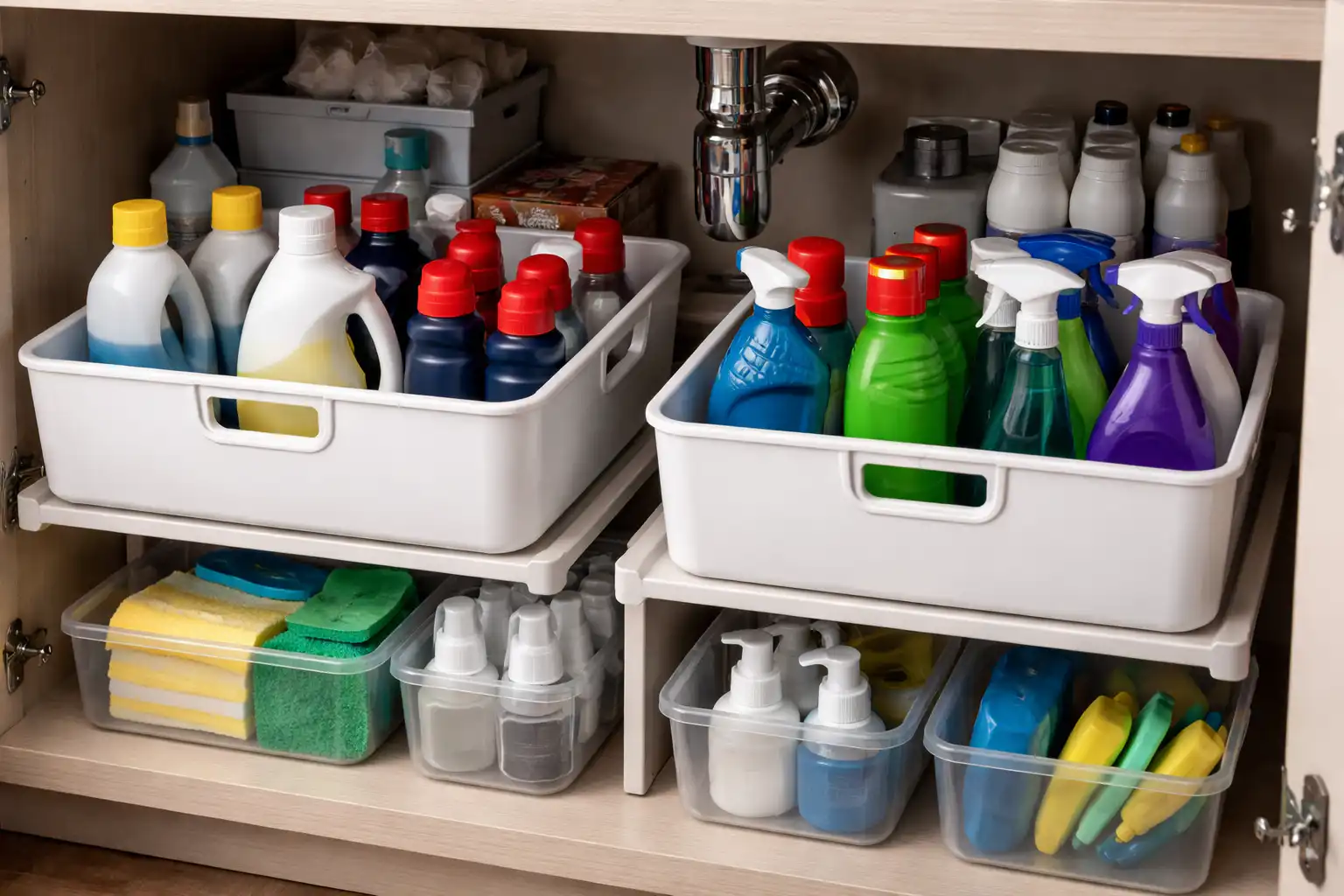 Sfatul meu personal după ce am revizuit sute de bucătării: utilizați tăvi rotative pentru a depozita flacoane cu substanțe chimice sub chiuvetă. Acest lucru elimină necesitatea de a căuta adânc într-un dulap întunecos și reduce la zero riscul de a răsturna accidental și de a vărsa lichide periculoase.