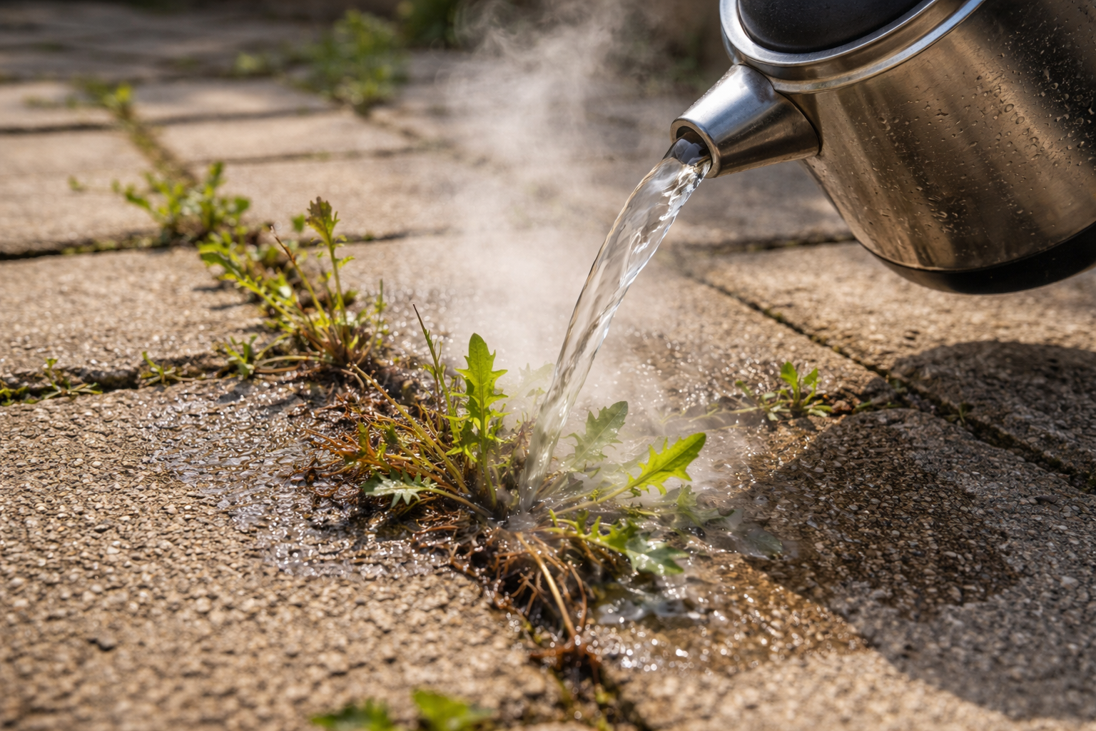 Scaldarea termică puternică cu apă clocotită ucide perfect partea de deasupra solului și rădăcinile lăstarilor mici, dar pentru plantele perene mari, cum ar fi păpădia, această procedură va trebui repetată de mai multe ori la rând.