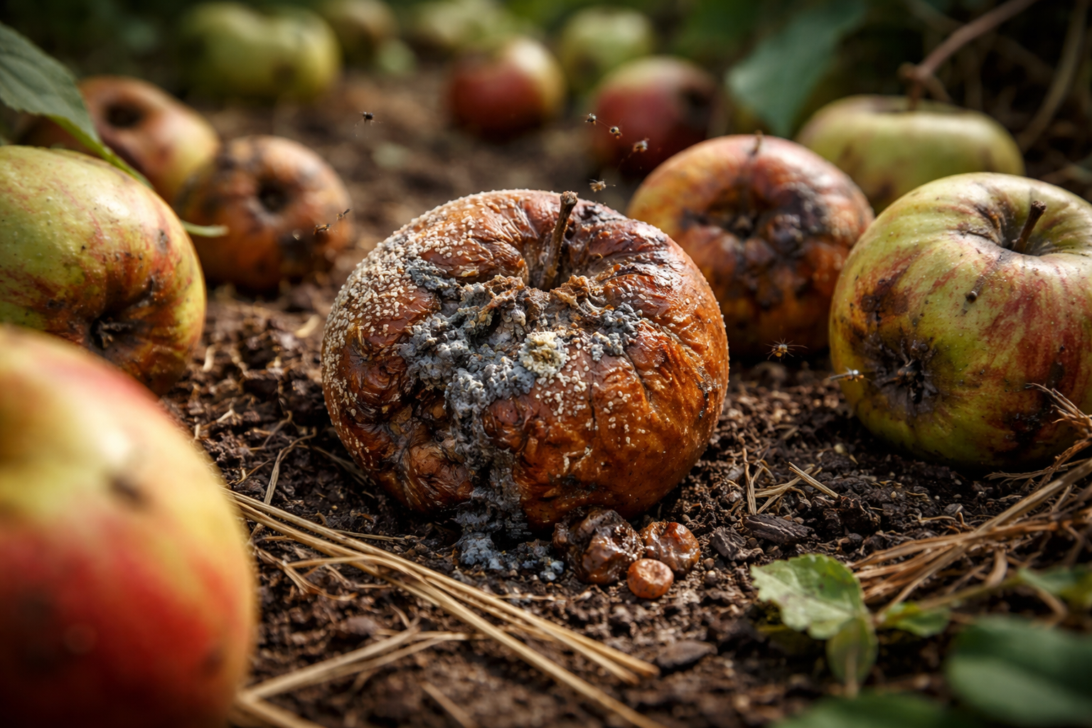 Fructele sau legumele căzute și care încep să se strice par a fi gunoaie organice inofensive care vor deveni în cele din urmă îngrășământ propriu-zis. În practică fructe stricate acționează ca un incubator ideal pentru agenții patogeni periculoși.