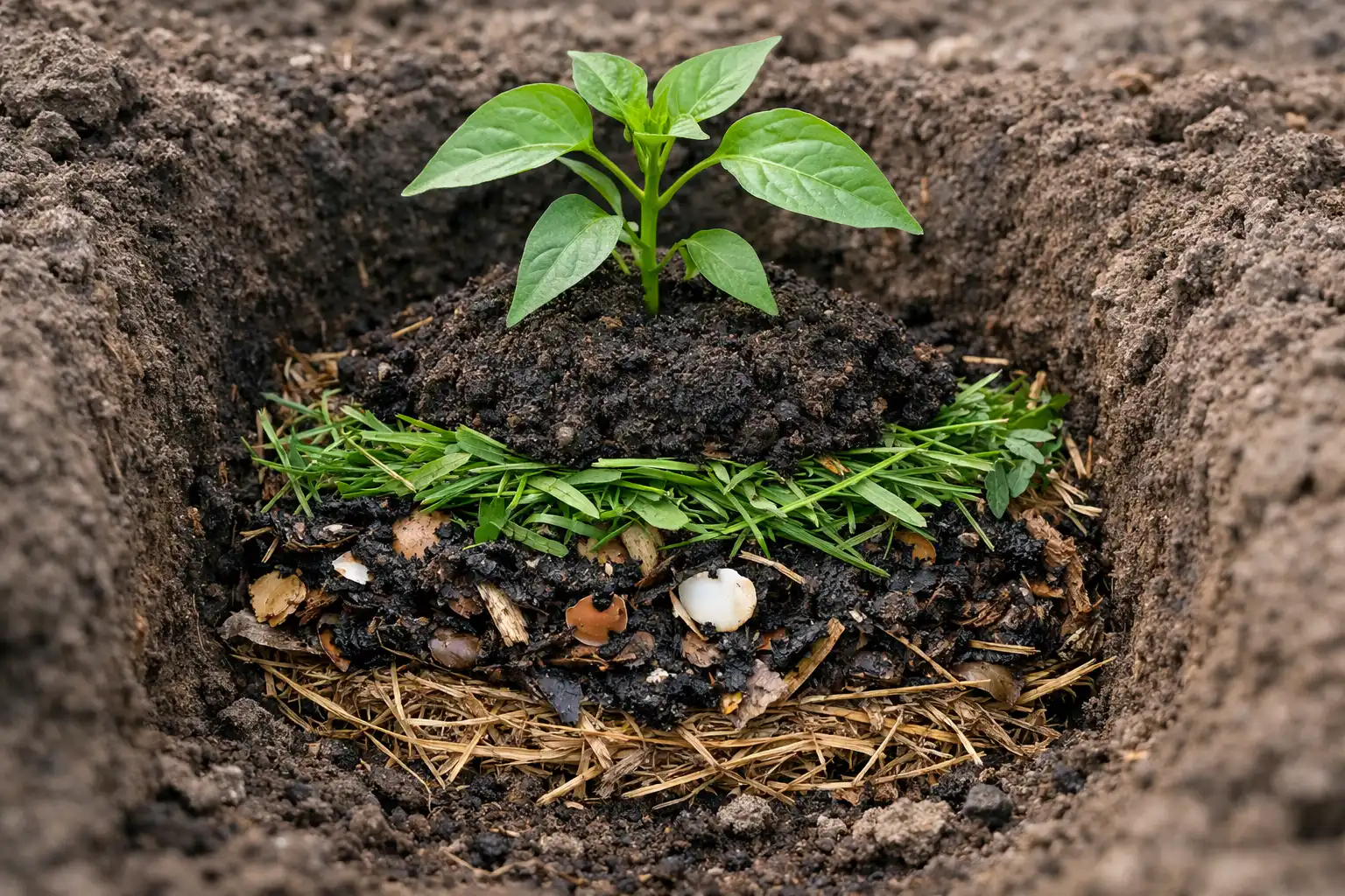 Trebuie să folosiți ingredientele potrivite pentru a crea mediul nutritiv potrivit la fundul gropii: – iarbă sau urzici proaspăt tăiate – un pumn de cenușă de lemn pentru dezoxidare – puțin humus sau compost matur – un strat de pământ obișnuit pentru a izola rădăcinile de materia organică care arde