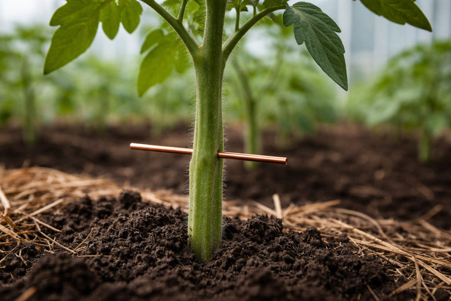 Perforarea tulpinii cu o bucată de cupru funcționează ca un fel de inoculare pentru răsaduri. Seva internă a plantei interacționează cu metalul, saturându-l cu ioni, ceea ce crește semnificativ imunitatea naturală împotriva phytophthora și alte boli periculoase. Acest proces are loc treptat, asigurând arbuștilor o aprovizionare continuă cu un micronutrient important pe parcursul tuturor lunilor de vegetație.