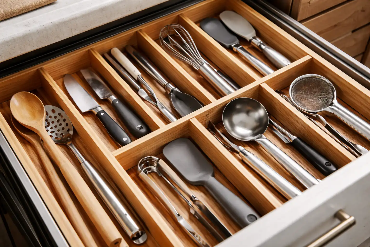 O grămadă de polonice, mustăți și cuțite într-un sertar este foarte enervantă și te face să pierzi timp prețios atunci când gătești. Organizez spațiul din bucătărie de mulți ani și știu cum să rezolv rapid această problemă: vă voi împărtăși câteva soluții testate care vă vor ajuta să puneți lucrurile într-o ordine perfectă o dată pentru totdeauna.