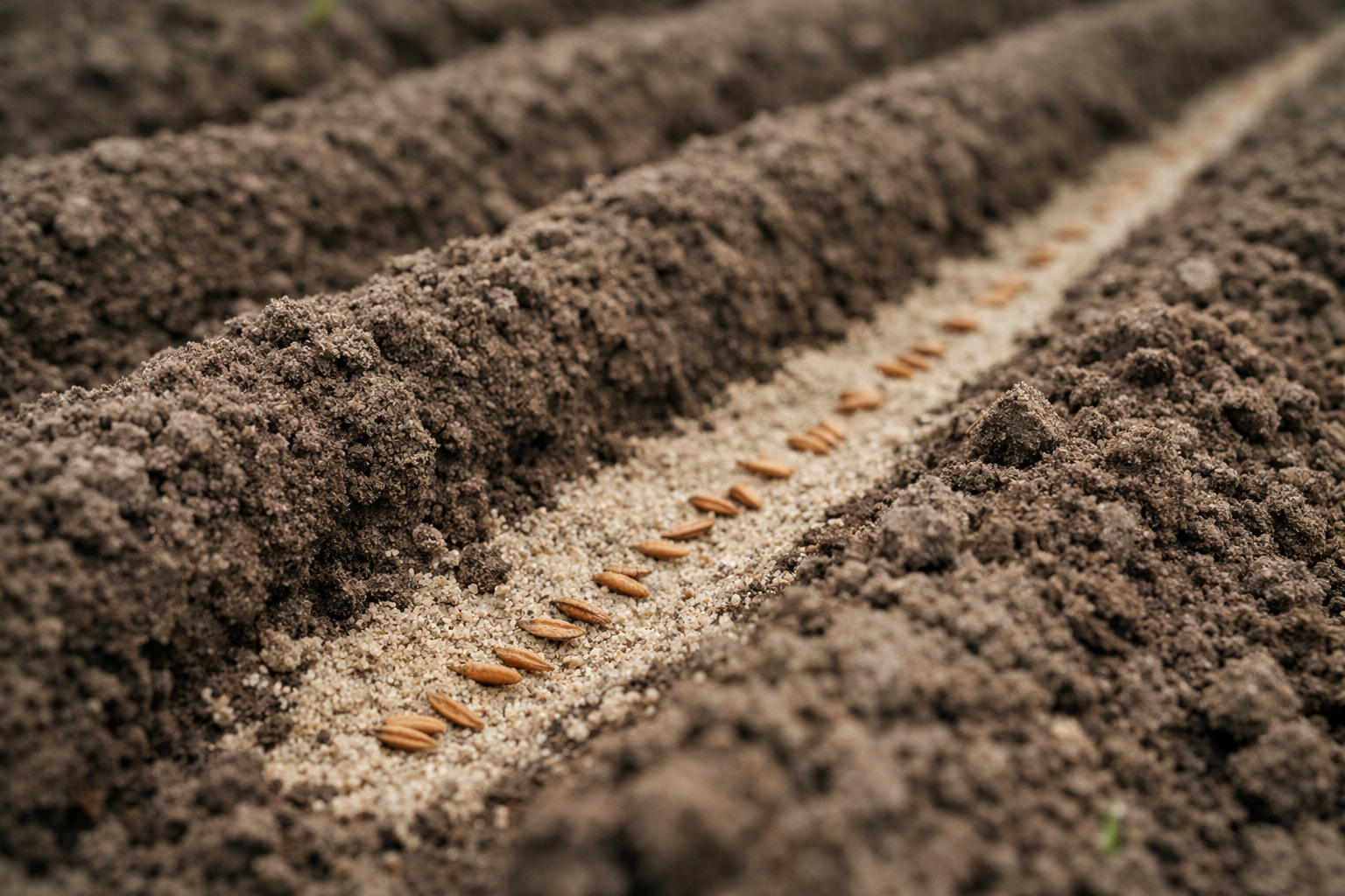 – Alegeți numai semințe proaspete din anul curent, deoarece rata lor de germinare scade rapid în timp. – Spălați în prealabil semințele în apă caldă pentru a elimina parțial uleiurile esențiale care inhibă germinarea. – Formați șanțuri la o adâncime strict uniformă, compactând fundul șanțurilor cu un tăietor de unelte.