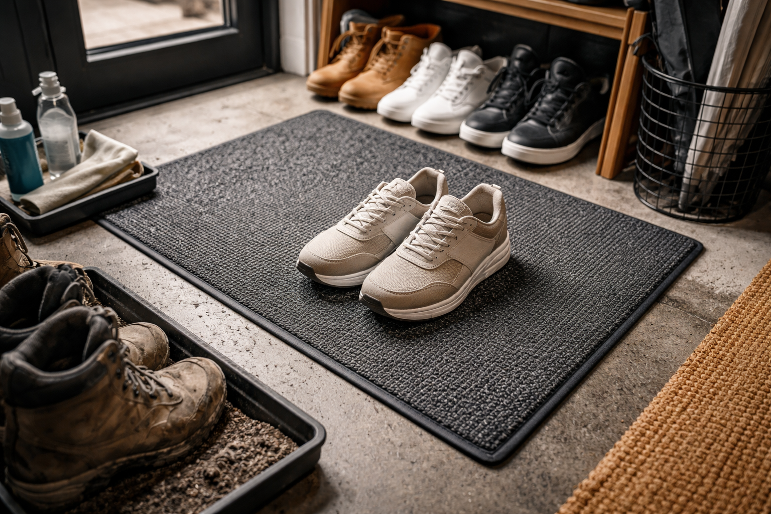 Utilizare covor de umiditate cu o grămadă tare la exterior și o grămadă moale la interior.