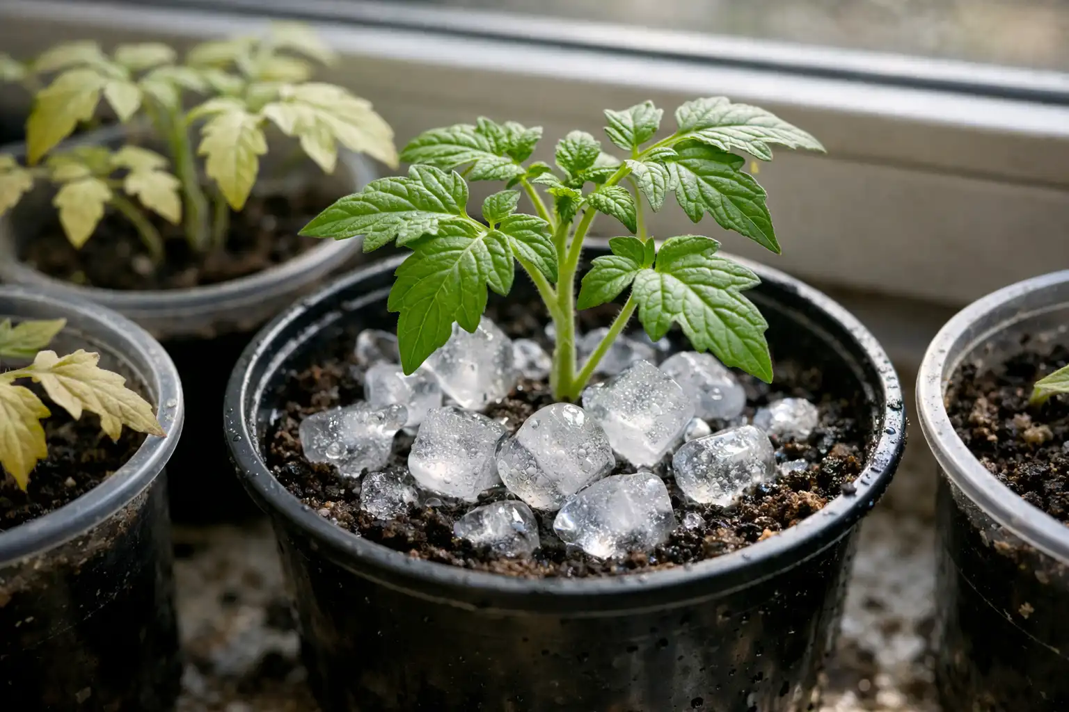 Când soarele de primăvară începe să strălucească prin geamul ferestrei, temperatura solului din paharele mici de plastic crește rapid. Apare un periculos stres termic care determină stagnarea sistemului radicular. În astfel de condiții, rădăcinile opresc complet asimilarea azotului și a micronutrienților. Rezultatul este o cloroză rapidă, în care frunzele tinere își pierd culoarea bogată și devin aproape albe.