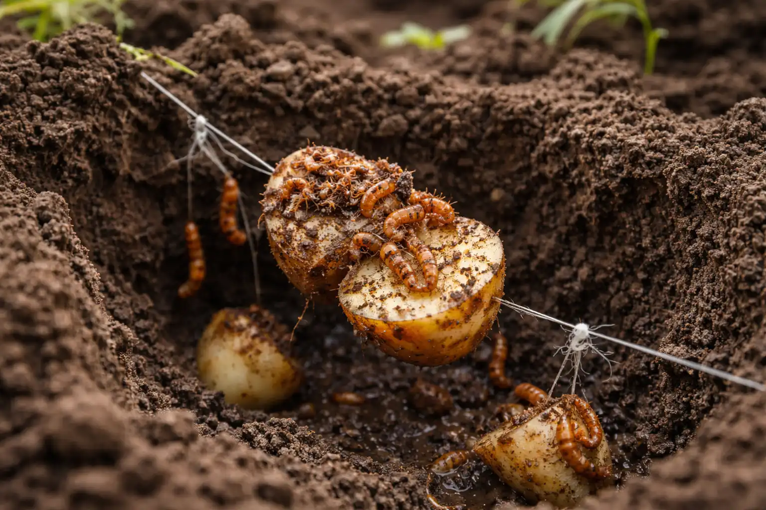 Larvele gândacului de pelin sunt extrem de sensibile la schimbările din sol chiar primăvara, când urcă în straturile superioare în căutare de hrană. Utilizare capcane cu momeală – este cea mai ecologică și eficientă metodă, pe care am testat-o pe propria experiență. În acest scop, este suficient să îngropați bucăți de cartofi cruzi sau morcovi înșirați pe un fir de pescuit la o adâncime de zece centimetri.