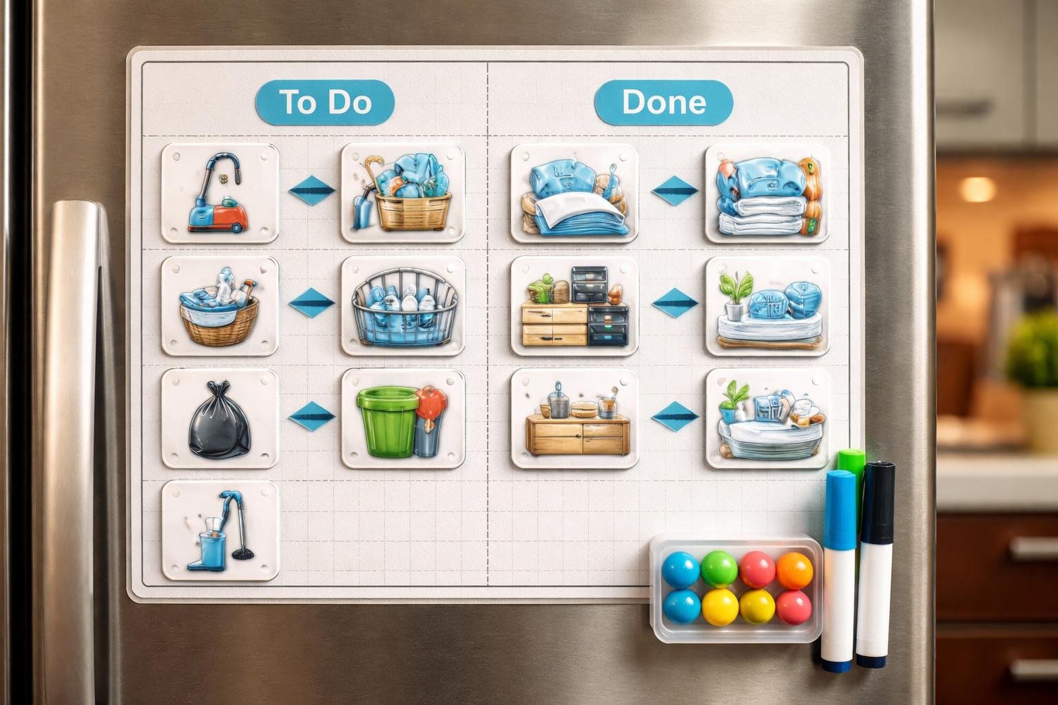 Nuanță secretă: creați o tablă vizuală cu magneți unde fiecare membru al familiei poate marca independent sarcinile finalizate, mutându-le în mod fericit din coloana „de făcut” în coloana „făcut”.