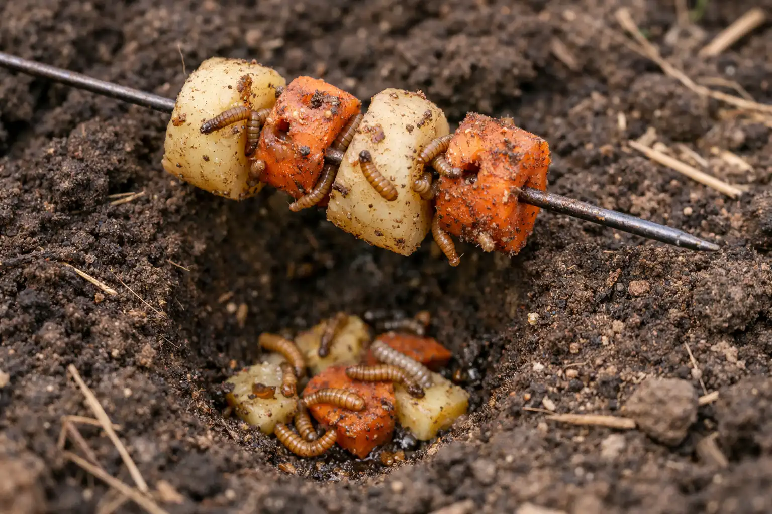 Pentru a crea o capcană eficientă, este suficient să tăiați cartofii sau morcovii vechi în bucăți mari. Acestea trebuie înșirate pe un fir și îngropate la zece până la cincisprezece centimetri adâncime în diferite părți ale grădinii de legume.