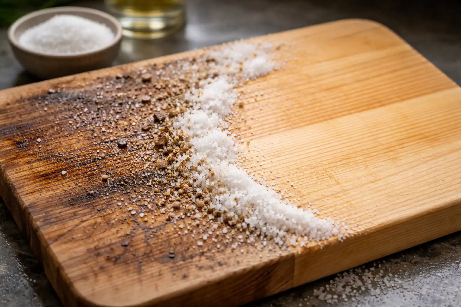 Lemnul are o structură poroasă. Detergenții standard spală doar grăsimea de la suprafață, prinzând germenii și sucurile din alimente adânc în fibre. Pentru a extrage murdăria, vom avea nevoie de absorbanți naturali și acizi alimentari.