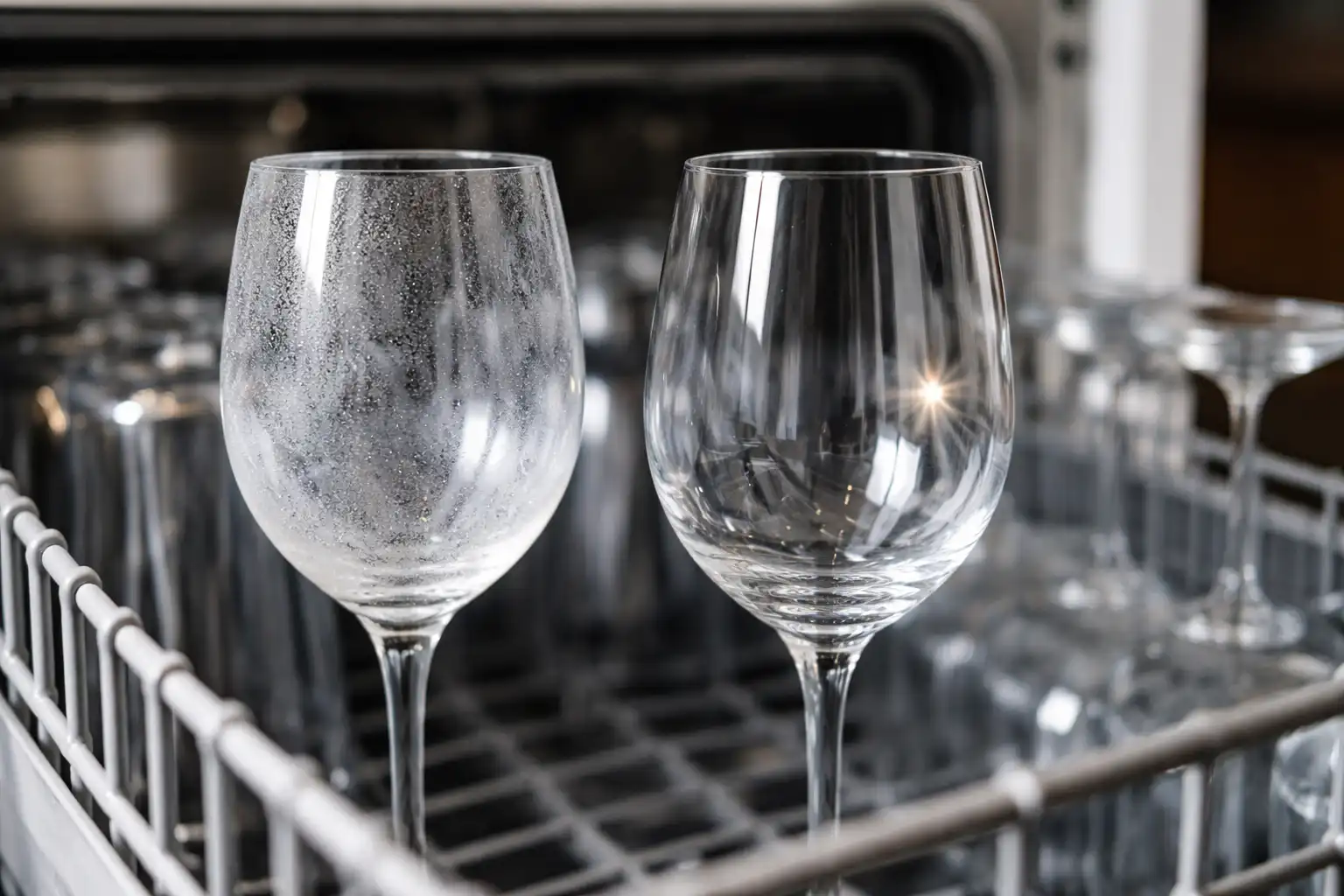 Pe paharele transparente, depunerile minerale sunt pur și simplu cele mai vizibile din cauza modului în care lumina trece prin material, deși stratul de calcar se depune uniform pe toate vasele.