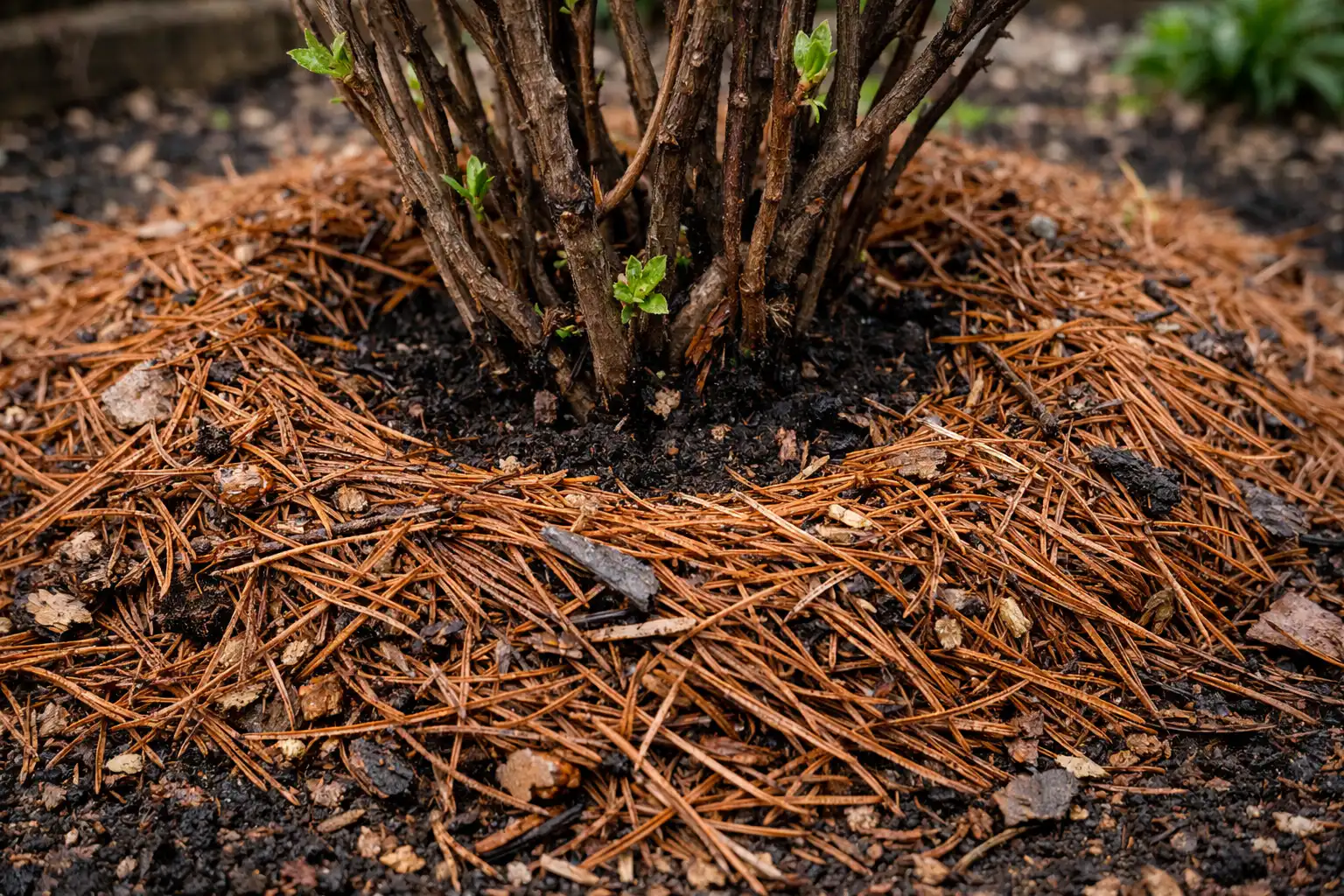 – Mai întâi, udați abundent tufele cu apă curată – Întindeți un strat de humus sau compost – Așezați acele uniform, la câțiva centimetri distanță de trunchi – Apasă ușor perna cu mâinile pentru a evita ca aceasta să fie spulberată de vânt