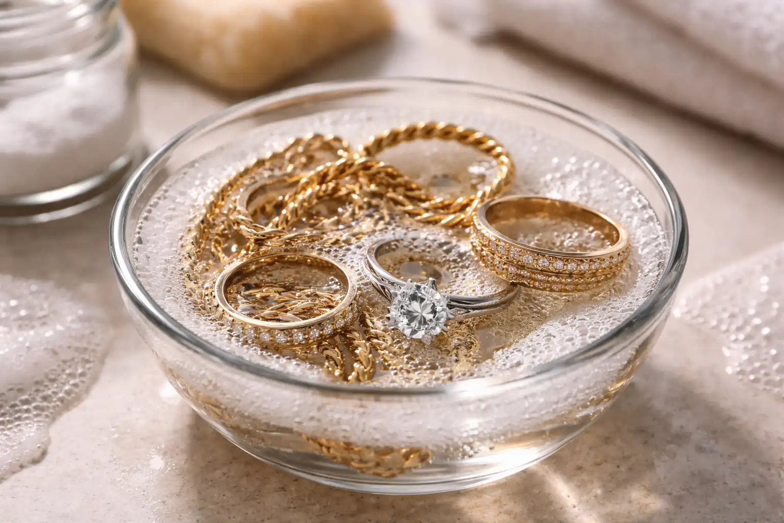 Principalul secret al unei curățări perfecte constă în temperatura apei: aceasta trebuie să fie moderat de caldă pentru a dizolva eficient grăsimea pielii, dar fără a deteriora adezivul de bijuterii care fixează pietrele.