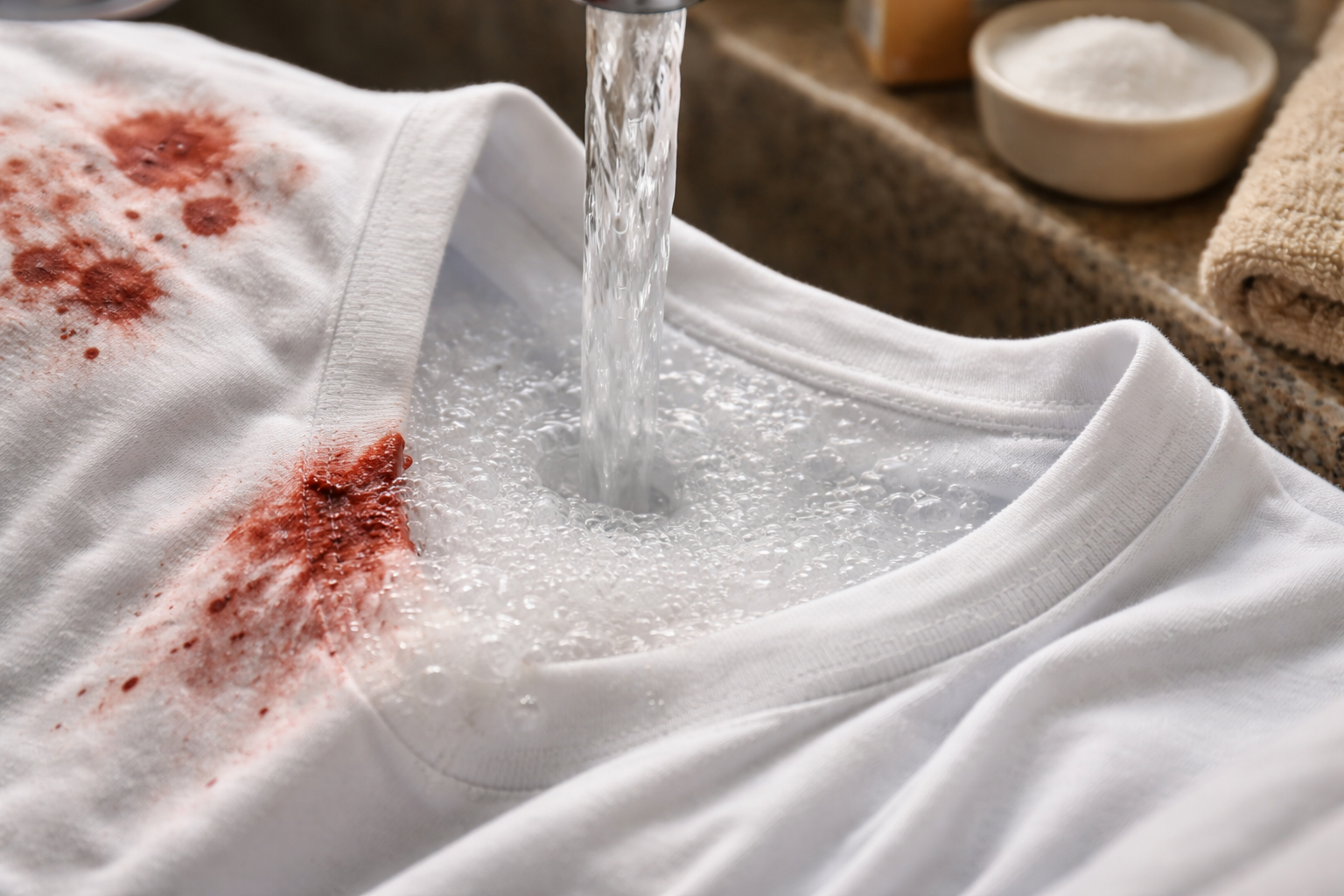 Principala regulă pentru îndepărtarea sângelui este să folosiți numai apă rece, deoarece temperatura ridicată gătește proteina chiar în interiorul fibrelor, transformând-o într-un colorant indelebil.