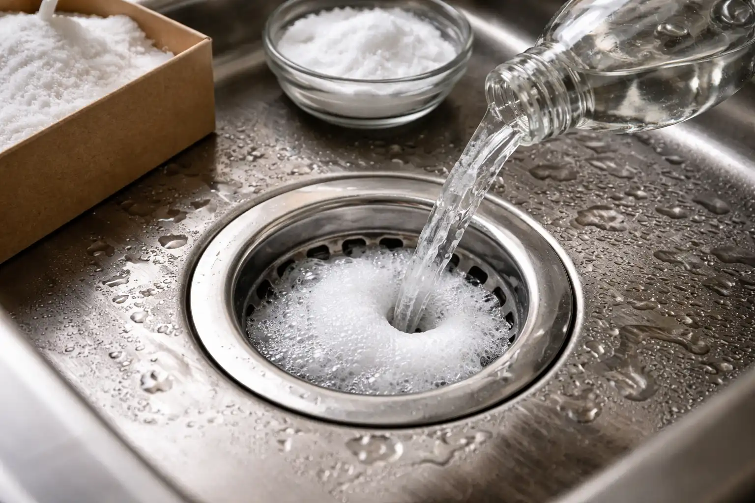 Principalul secret al eficienței este să turnați bicarbonatul de sodiu uscat direct în scurgere, mai degrabă decât să îl amestecați cu oțet în prealabil, altfel reacția benefică de efervescență și divizare se va irosi în pahar.
