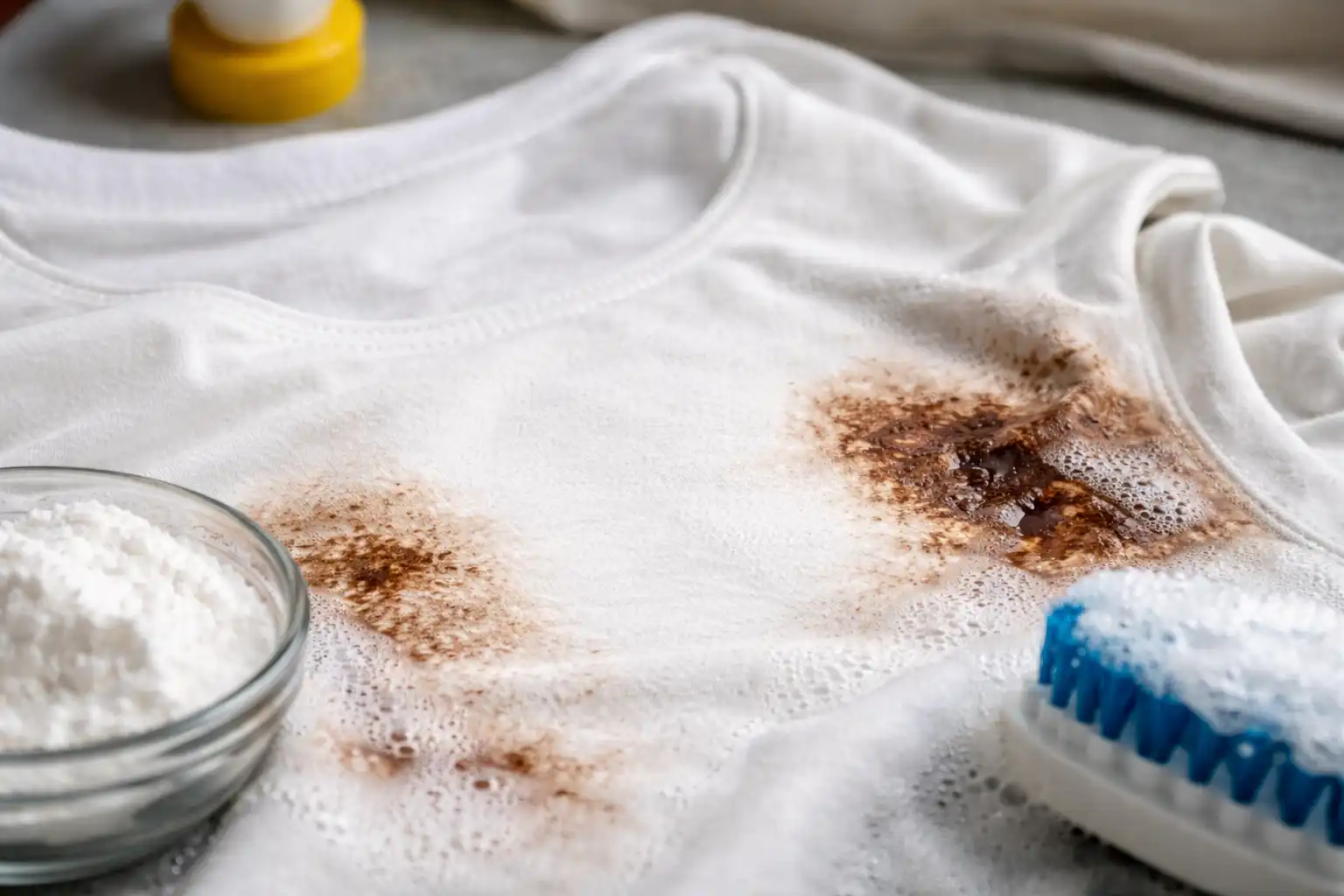 După ce baza de grăsime s-a dizolvat, adesea rămâne în urmă un ușor contur maro. Acest fenomen rezidual poate fi rezolvat perfect cu un detergent lichid obișnuit de spălat vase aplicat local înainte de spălarea principală. Pigmentul este descompus de agenții spumanți activi, readucând firele la puritatea lor inițială.