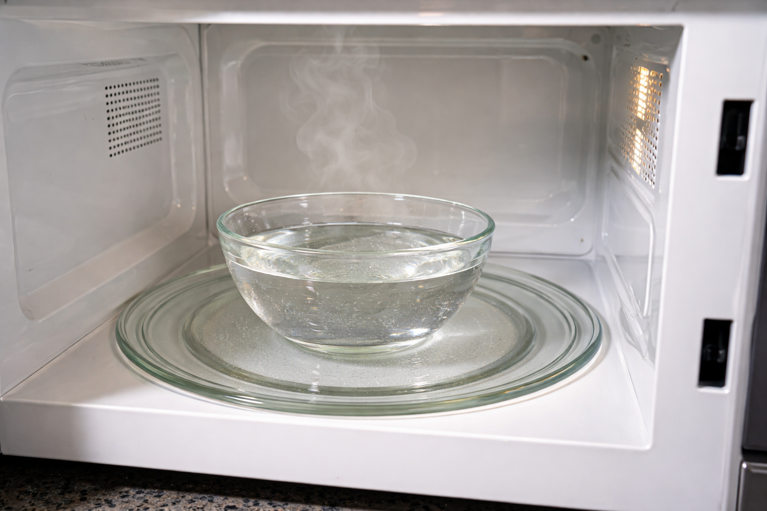 Mulți oameni sunt obișnuiți să frece pereții interiori cu bureți rigizi, irosind mult efort. Cu toate acestea curățarea cuptorului cu microunde merge mult mai ușor dacă folosiți puterea căldurii umede. Această abordare dizolvă ușor murdăria fără a deteriora smalțul sau oțelul inoxidabil.