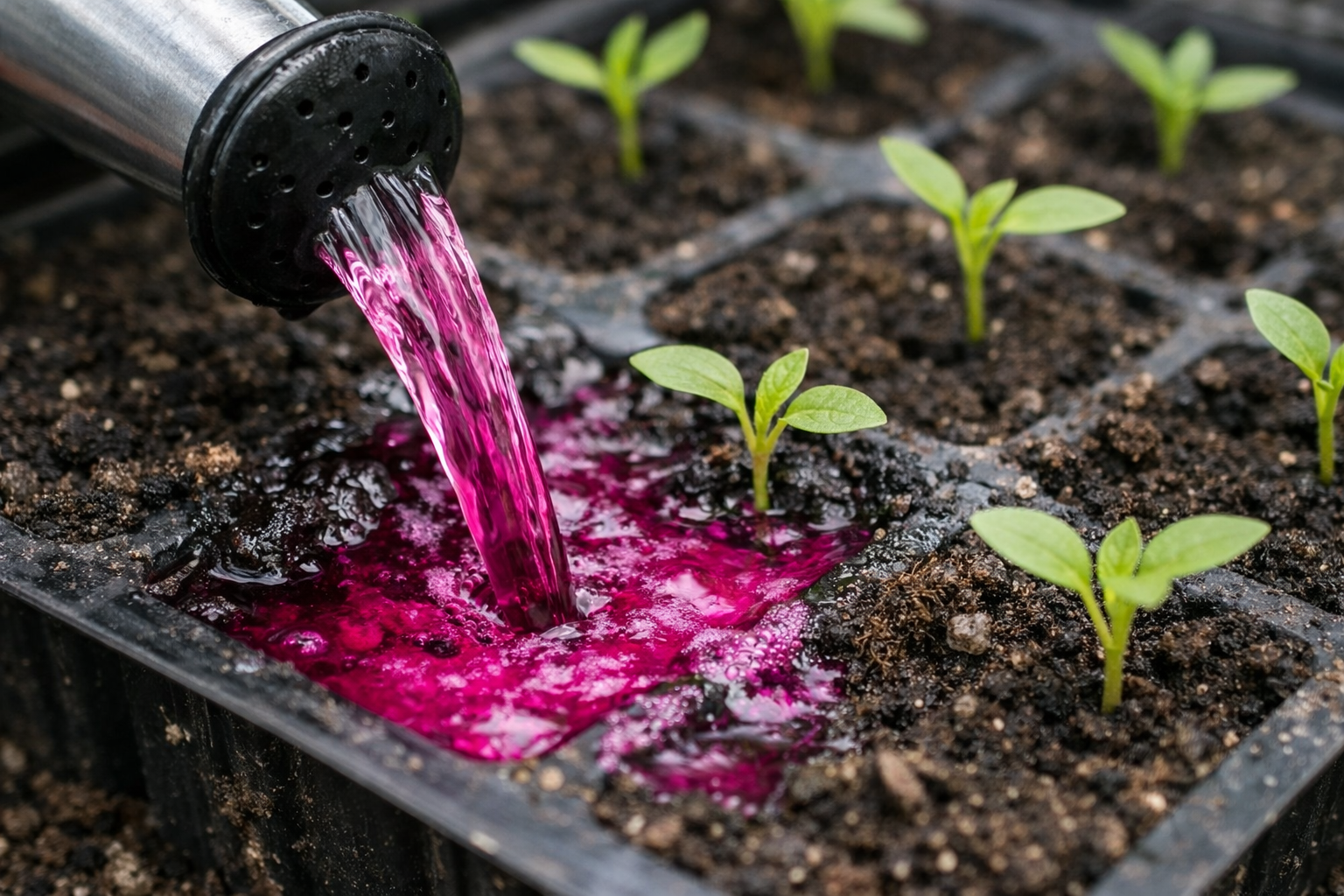 Da, o soluție caldă ușor roz protejează perfect răsadurile de acasă de apariția muscăi periculoase a solului și de dezvoltarea în masă a piciorului negru.