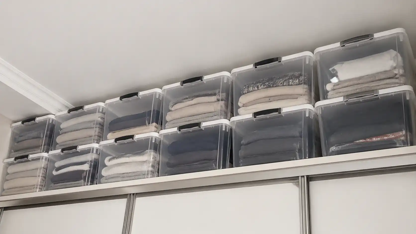 Sfat secret: utilizați recipiente din plastic transparent de aceeași dimensiune, astfel încât să puteți vedea cu ușurință conținutul de jos, fără a compromite estetica generală a camerei.