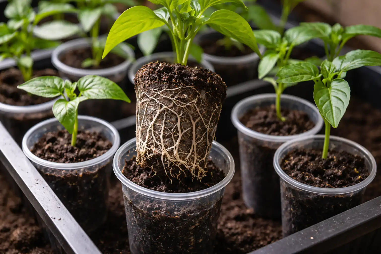 Principalul truc al creșterii este că sistemul radicular Sistemul radicular al ardeilor se dezvoltă într-un mod specific. Dacă puneți un răsad mic într-un ghiveci imens, solul din jurul rădăcinilor latente se va acri.