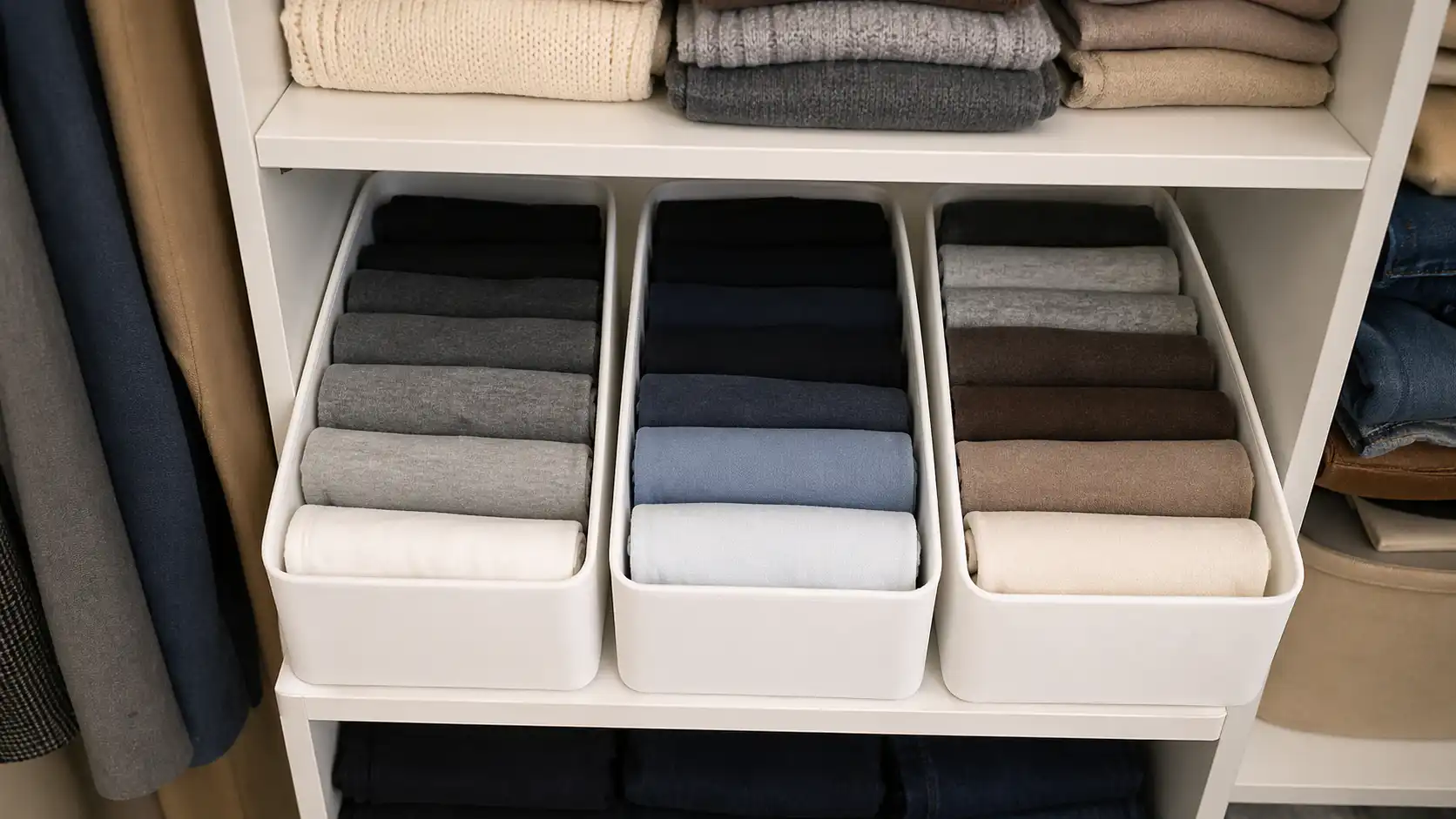 Principala regulă a ergonomiei este că doar ceea ce purtați în momentul respectiv ar trebui să fie la acces rapid. Restul ar trebui să fie păstrat în mod corespunzător. Saci de vid și cutiile rigide sunt perfecte pentru îmbrăcămintea exterioară și articolele voluminoase din garderobă.