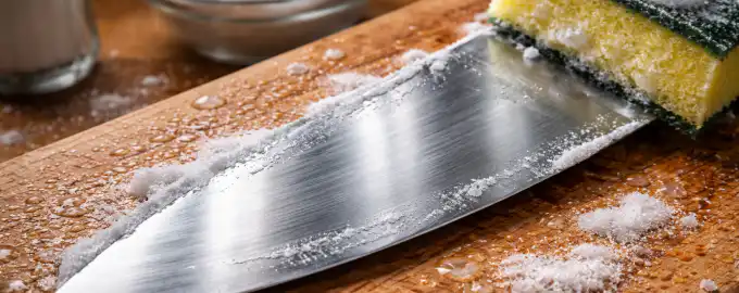 Pentru a elimina rapid depunerile lipicioase și petele de oxidare fără a distruge tăișul, aplică o pastă din bicarbonat de sodiu și apă călduță pe lamă, las-o să.